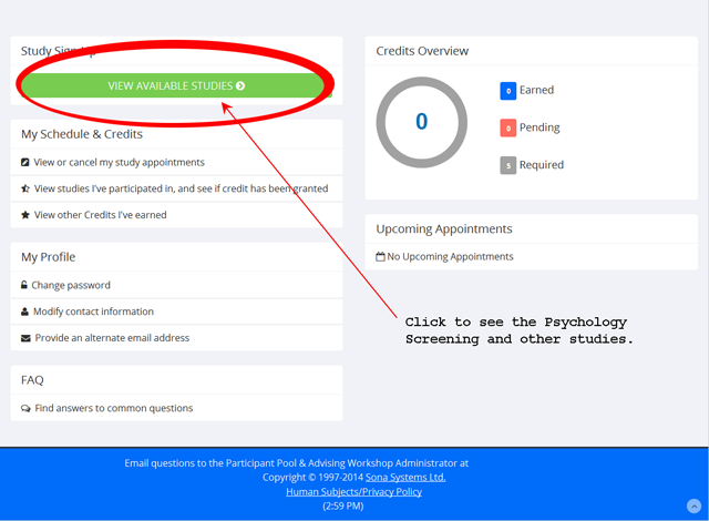 Instructions to access screeningNOTE: Complete the Screening right away when you register. DO NOT wait for the END date. The date listed on Sona Systems is an END date and not a participation date. Complete all six steps and SEE THE MESSAGE that you received credit.Outline of the main steps includes: