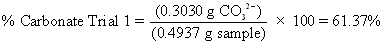 The percent carbonate in the sample used in Trial 1 is based on the mass of carbonate ion in the sample (0.3030 g CO32-) and the total mass of the sample before reaction (0.4937 g).