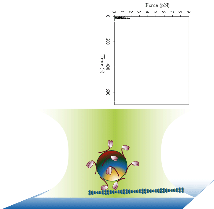 Optical traps use photon momentum to capture and hold small transparent particles with a higher refractive index than the medium. As a trapped particle moves away form the laser focus there is a restoring force that is proportional to the distance the particle moves. Therefore, an optical trap can be used as a very sensitive force tranducer that can measure forces in the piconewton range.