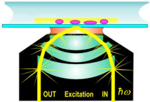 TIRF microscopy is achieved by aiming an excitation laser onto a microscope glass slide beyond the critical angle of refraction. This can be done either through a microscope objective, as shown on the picture, or through a glass prism. In either case, the resulting evanescent wave excites fluorophores only very near the glass surface and greatly reduces fluorescent background from fluorophore in solution. This makes assays with large amounts of labeled protein in solution possible, such as assembly assays of labeled G-actin into F-actin filaments.